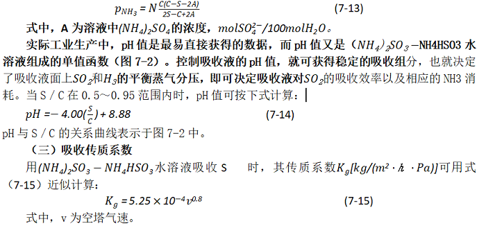 由以上敘述可知,(NH4)2SO3-NH4HSO3水溶液中的(NH4)2SO3與 NH4HSO3的組成狀況對(duì)吸收影響很大,而控制吸收液組成的重要依據(jù)是吸收液上的SO2 和NH3的分壓PSO2、PNH』。在吸收液pH值為4.71~5.96時(shí),這些分壓值可用約翰斯通公式計(jì)算: